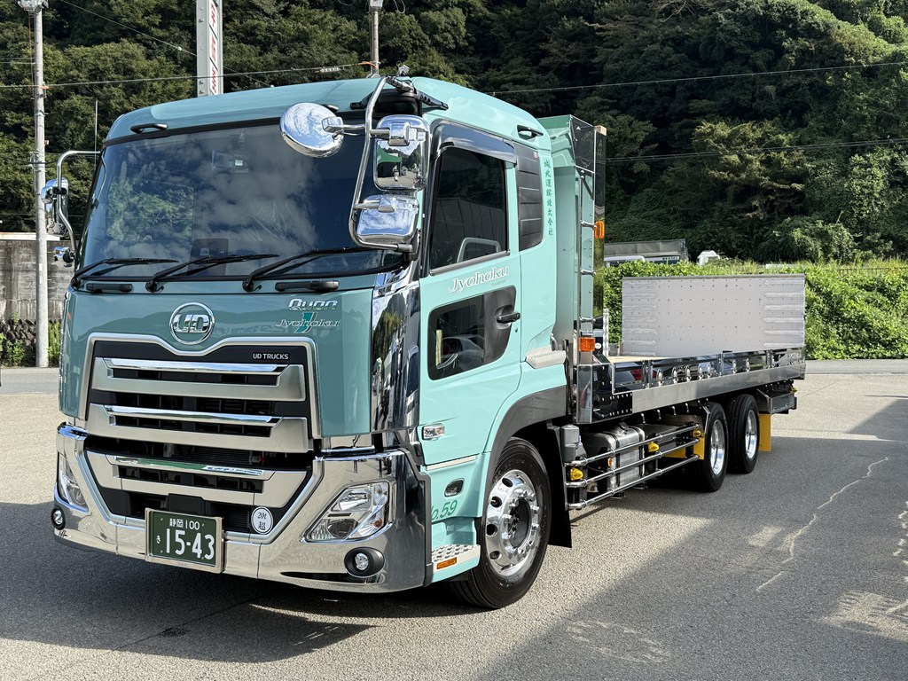 「UDトラックス 後軸エアサスペンション仕様の重機輸送用セルフローダー(クオン(8×4) GVW25t 4軸低床)」を導入しました。安全装置(横滑り時制動力・駆動力制御装置・ふらつき注意喚起装置・車線逸脱警報装置)やバック&サイドカメラ付きで、安全面にも十分配慮した車両です。
